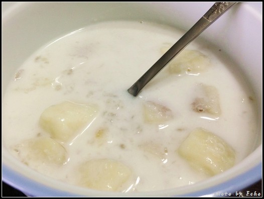 半罐椰汁、一点西米、一大个芋头,外加几个面包就足够一家人晚饭的哟!椰汁那个香浓呀(*′▽`*)~