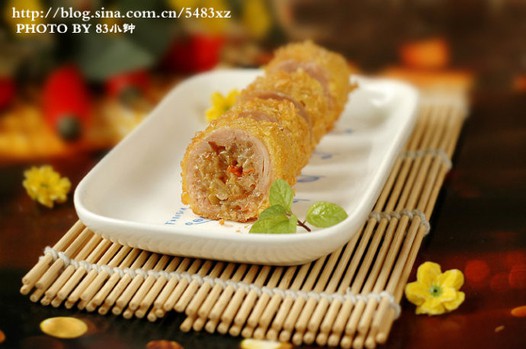 三、炸鸡肉卷的时侯注意火侯,炸好的东西出锅后颜色会加深。所以,当鸡肉卷的颜色比你想要的浅一度时出锅最好。
