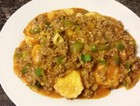 二、把猪肥肉、鸡胸肉、虾皮剁碎,加入淀粉、味精、胡椒和均匀,竹荪煮五分钟,豌豆煮十分钟