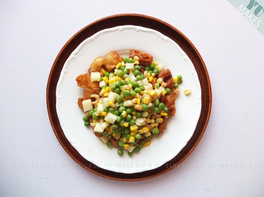 青豆玉米少一点,多一点汤会更好的~~这样油条才会软~~~另外虾干还是加的好,会非常有味道