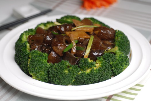 七、加入葱段即可出锅,直接盛入摆好圆圈的西兰花里