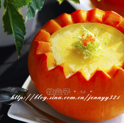 这是我非常喜欢的一款甜品,蛋奶液混合了南瓜的清甜,味道口感都配合得天衣无缝,清新甜蜜而不腻味,是一款健康美味的心水之选。我选用了品质外形俱佳,可谓人见人爱的东升南瓜来做这款南瓜盅,卖相、口感、味道均令人满意。吃蛋的时候,顺便舀一些南瓜肉同吃,那种感觉,很美妙哦!吃完了蛋,再把南瓜干掉,哈哈,很痛快的说~东升南瓜是南瓜中的上品,色泽艳丽,外形小巧美观,果肉厚,甘甜而粉沙,甜度适中,有板栗余香,口感远胜普通南瓜。南瓜含有丰富的钴,在各类蔬菜中含钻量居首位。钴能活跃人体的新陈代谢,促进造血功能,并参与人体内维生素B12的合成,是人体胰岛细胞所必须的微量元素,对防治糖尿病,降低血糖有特殊疗效。如果把糖换成健康的果糖,就是适合糖尿病人健康甜品了。我国是糖尿病人高速增长的国家,很多年长的人血糖都偏高。做这样一款甜品,用它孝敬父母长辈,也是很合适的。