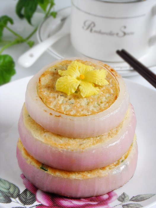 圈圈鸡蛋饼,就是用洋葱圈做模具,配以甜菜脯和虾米,做成的蛋饼。最大圈的给爸爸,不大不小的给妈妈,最小圈的给宝宝。一起吃个这样的早餐,很温馨吧!