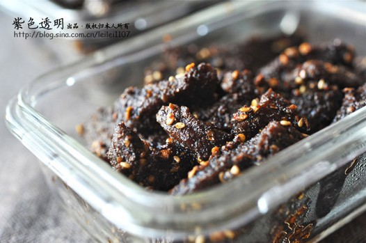 每次回娘家,我都是“轻松”的回去,“沉重”的离开。回去的时候爸妈总说,啥也别买,什么都不缺啊。从父母家出来的时候,那简直就是大包小包,爸妈恨不得把能装的都给我装回来。这几块牦牛肉就是特意给我留着的,知道我喜欢捣鼓吃的,特意给我冷冻的生肉。爸妈知道我家冰箱冷藏室的东西种类较多,地方也有限,太大块的牛肉放不下,还很贴心的把肉分成差不多大小的块,好储存也好制作。说回牦牛,是世界三大高寒动物之一,属半野生天然绿色食品。在当今港澳和西欧市场上,牦牛肉被誉为“肉牛之冠”。牦牛肉以富含蛋白质和低脂肪而名列肉类前茅,据说是国际市场上稀少的高级肉类。因此我是一直没想好拿来做什么。周末突然嘴馋牛肉干,最终没能抵御住嘴馋,还是用来做了牛肉干。以前做过咖喱牛肉干,这次换种做法,试试在老傅家看到的麻辣牛肉干。做法并不复杂,味道相当好。做好后试了味道很嫩,好嚼也好吃。如果没有牦牛肉可以用牛腿肉代替,味道一样好呦。我用了800克的牦牛肉啊,只出来这么两小盒牛肉干,缩水很严重,浓缩的都是精华吧,哈哈。小提示:切牛肉的时候条可粗可细,但一定要横切牛肉,切断纹理,吃起来就很容易咬啦,切忌呦。