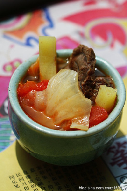 四、炒锅入少油将番茄块炒出红油再倒入卷心菜煸过和土豆条一同倒入炖好的牛肉汤里