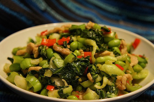 三、锅下热油,煸白肉丝盛起,再加油依次倒入红椒丁、毛豆米、青菜丝和肉丝一起翻炒,加少许生抽、糖调味炒匀即可。