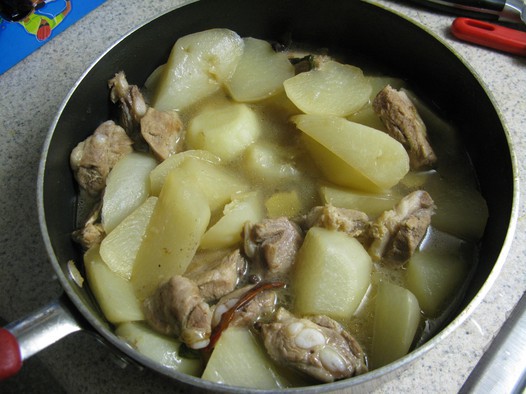 四、放萝卜和排骨,加水没过排骨和萝卜。