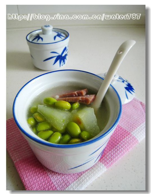 二、取一汤锅,先放入清水和毛豆煮10分钟,待用;(毛豆比冬瓜不易熟,要先煮一会)
