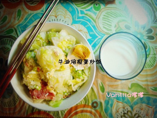 牛油翻炒包裹蛋液的培根加上包菜和米饭年糕~营养全面满足一个人住的一人一锅一煮原则~好吃!