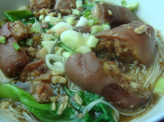 四、另锅烧水,下面线煮熟捞起盛入碗中,放上猪脚,加点青菜.撒葱花再舀汤浇上即可享用