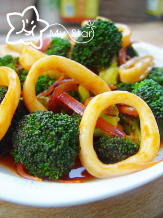 二、西兰花洗干净,在开水里烫断生;鱿鱼洗净,也过开水烫一下;洋葱切丝