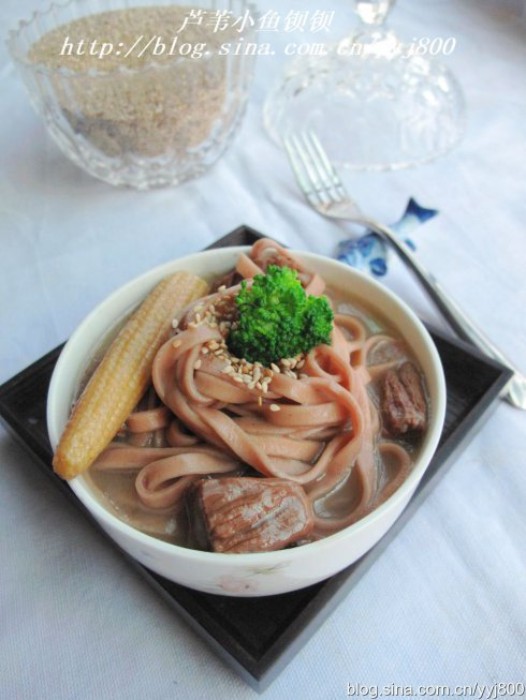 一、西兰花加盐或碱粉浸洗净切碎,在开水中焯熟放入冰水中(可不放)二、锅内注水倒入老火牛肉汤煮开,加入面条,用筷子划散(加面条时应先将面条甩散松开,