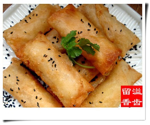 三、倒半锅油.等油热时,把春卷放进去炸至金黄色,捞出盛盘.撒上些熟芝麻即OK啦