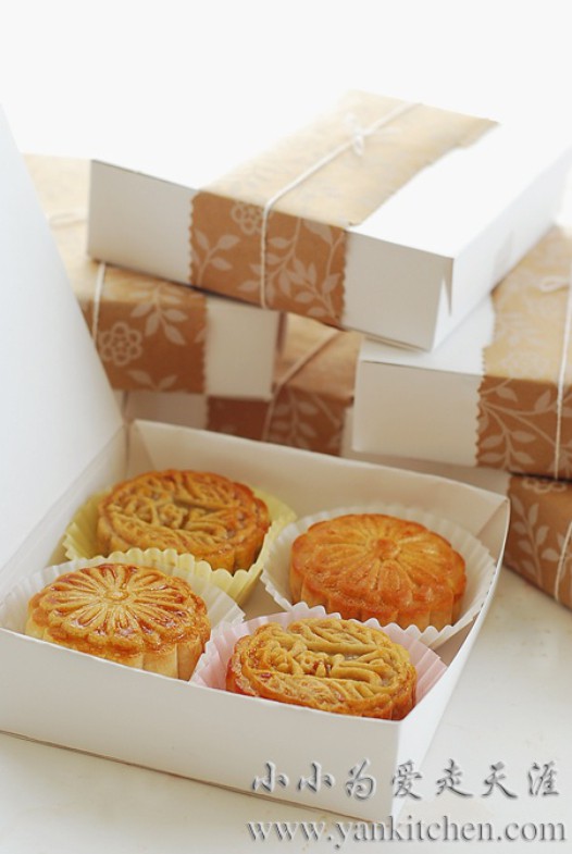 二、烤箱預熱至160C/325F。取一份餡料,包入鹹蛋黃,收口搓圓之後,取餅皮麵糰一份,搓圓壓扁成圓片狀,放入餡料,一邊推薄餅皮、一邊用虎口收攏開口。然後在表面薄薄地撲上一層麵粉,放入壓模中壓緊,扣出。排在烤盤上,先放入烤箱烤焙6分鐘,取出,刷上蛋黃液,放回烤箱繼續烘烤約15分鐘直到上色