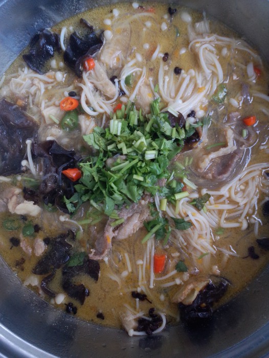 五、然后加入木耳煮开,再加入金针菇,粉丝,煮开后,加入肥牛,开锅后淋上白醋就可以关火了。