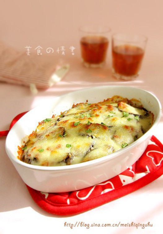 五、茄子煎好后取来烤箱容器,在容器内抹上一层黄油,放入煎好的茄子,淋上剩下的肉酱,撒上些炒香的蒜末,最后撒一层奶酪丝,烤箱预热至200度,烤20-25分钟即可