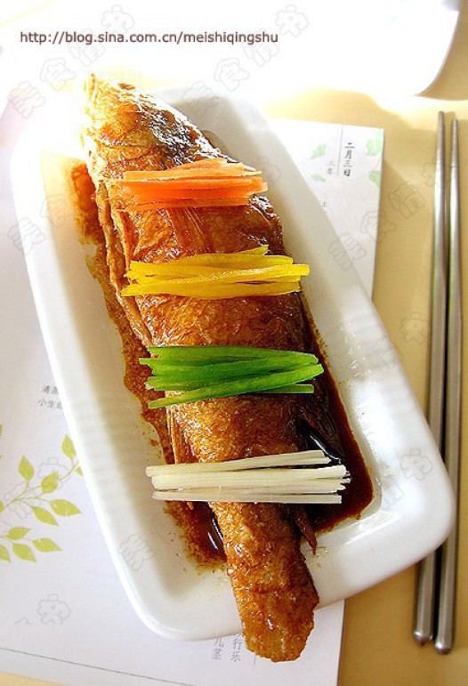 三、腌渍鱼的时间准备一点彩椒丝,或准备几种颜色的蔬菜,洗净切细丝,最后摆在鱼身上做装饰。蔬菜切好后,再调一碗芡汁,将酱油、料酒、盐、白糖、醋、清水混合均匀调成芡汁。如果只做干煎黄鱼,这步就省略了