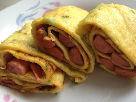 六、再把香肠放在上面,卷起鸡蛋饼即可。