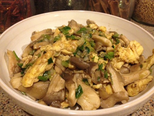 三、热锅1汤匙油,转小火爆香葱花,慢慢熬一会儿(15-20秒)葱油。转大火下蚝菇一起翻炒,加1/2茶匙盐,炒至蚝菇出水。把鸡蛋块倒进去一起翻炒,鸡蛋块会把蚝菇炒出来的水吸收。撒上五香粉搅拌均匀。出锅装盘。