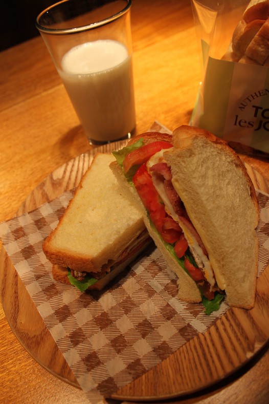 自制的鸡蛋培根三明治,非常适合做早餐。营养丰富全面,搭配了牛奶,可谓是完美一餐。