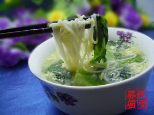 二、热锅,放少许油,放入生菜稍微炒一下,加入开水,将面条放入。煮熟,加入蛋液,加盐和蘑菇精调味即可