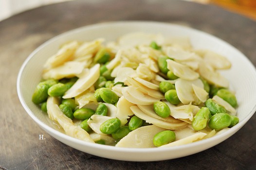 三、起油锅,同时放入毛豆和笋片,煸炒。