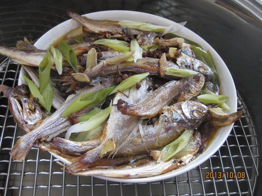 一、清洗干净小黄花咸鱼干控净水分放入花椒粒葱姜片淋上少许的花生油(去腥增香)