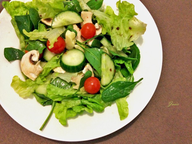 在巨大的沙拉碗里倒入黄瓜,蘑菇,小番茄,生菜叶,小菠菜叶,然后倒入两大勺意大利香醋汁(balsamic),拌匀