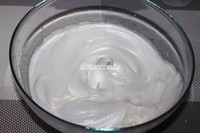 挖1/3蛋白糊到蛋黄糊中切拌,再加1/3,最后一起倒入蛋白盆中切拌,蛋糕糊倒入戚风模中轻磕;