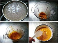把蒸好的南瓜去掉皮放入料理机中,加入牛奶,搅拌成糊。