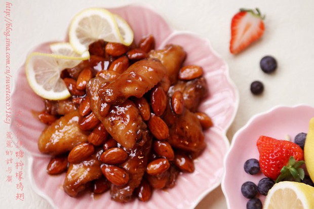 鸡身上什么地方最招人待见?当然得属鸡翅。有关鸡翅的做法能够专门出本菜谱的,保不齐市面上真有。我正在念叨着做什么口味的,两岁半的亚亚说“做鸡翅的时候要加糖醋排骨!”,想来前两天的糖醋排骨让她吃得意犹未尽,这也在意料之中,酸甜味的菜最受小朋友欢迎了。那好吧,就把鸡翅也做成酸甜的吧。如果做“糖醋鸡翅”,那听起来和“糖醋排骨”也没啥大区别,改番茄酱做酸甜味的?,貌似也是主流。怎么再弄点新意出来呢。转头看见老公正切柠檬泡水喝,呵呵,用柠檬来做酸甜口不就得了!柠檬是我家必备的东西,用柠檬做甜点对我而言已轻车熟路,弄个冰激凌和饮料啥的不在话下,做菜我只是在泰式的凉拌类里用到,用在鸡翅还是头一回,要创意,要试试。既然用柠檬来做,那就要体现柠檬特有的柑桔香味,如果出品颜色出来特别深,就表达不出那种独特的小清新风格。干脆老抽生抽一律不用,只用鱼露来提味提鲜。最近特别喜欢用广东米酒做菜,相对于黄酒而言味道更清爽,因此也用在里面了。不过鸡翅如果做出来颜色太白也没食欲,于是我想着完全用炒焦糖的方式让鸡翅上色,而且冰糖有和胃润肺、止咳化痰的功效,最近空气质量这么差,正好用来调理。最后炒出的琥珀色特别漂亮诱人,正是我预期的。为了去除鸡翅的大部分油脂,我只在锅里放了很少的一点油,先把鸡翅煸至表皮收紧,再放冰糖进去同炒,通过翻炒冰糖的火候让鸡翅的油份继续煸出来,这油同时又同步利用来炒出焦糖,又省火又省时。我把柠檬分成了两道程序来放进这道菜里。柠檬皮碎可以先放,让汁里先充满柠檬香,出锅前再把柠檬汁挤进去。大家都知道柠檬具有很强的美白功效,其中富含的维生素C正是这种功效的主要原因,只是维C很容易被高温所破坏,所以要在最后加入柠檬汁,这样不但能最大限度的保留维C,还能让鸡翅里的柠檬味道更浓郁。既然用到了柠檬和冰糖对抗恶劣的空气质量,那么索性再加强一下。最后我使出了杀手锏,撒一把大杏仁表表以为大杏仁只有瘦身抗衰老的功效,它也是抵抗糟糕空气的利器哟!好啦,大力推荐这道“大杏仁焦糖柠檬鸡翅”,柠檬的加入让酸甜变得更轻盈,鸡翅先煸再炖,让汤汁变得很有粘性,这种粘粘的酱汁又因为鱼露的加入而鲜咸适当,香脆的大杏仁裹上这样酸甜浓稠果香十足的酱汁,锦上添花!