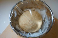 滚圆面团放入碗里,覆盖保鲜膜进行基本发酵(40度左右约25分钟)