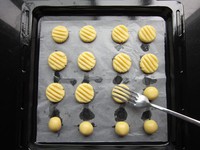 烤盘上垫好油纸,用餐叉压出花纹
