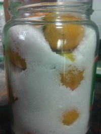 2. 把金桔放入玻璃瓶中,放一层放一层盐,满后用盖密封