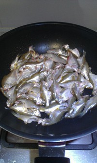 下小毛鱼翻炒,倒一点料酒,