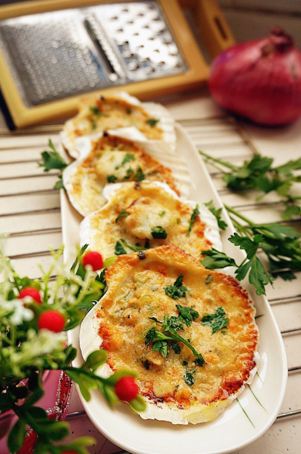 #乐购TESCO优鲜下厨房-海鲜#昨晚去一家意式餐厅吃饭,临走厚脸皮的问厨房讨了欧芹和奶油,回家做“芝士焗扇贝”。综合大厨的建议,摸索出了家庭版本,臻丝们学起来。1扇贝挖出洗净擦干,两面煎黄后填回壳内。2欧芹蒜洋葱切末,煸香后倒入奶油盐胡椒制成酱汁,淋在扇贝上,撒上芝士,放入预热的烤箱200度烤5分钟即可。