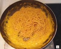 锅烧热橄榄油,倒入椰浆,南瓜泥中小火拌匀,如果是浓椰浆可加一点水后拌匀,放入1/2小匙的盐炒匀,迅速放入意面后和酱汁拌匀即可,盛盘后在表面撒上熟南瓜籽和意大利综合香料