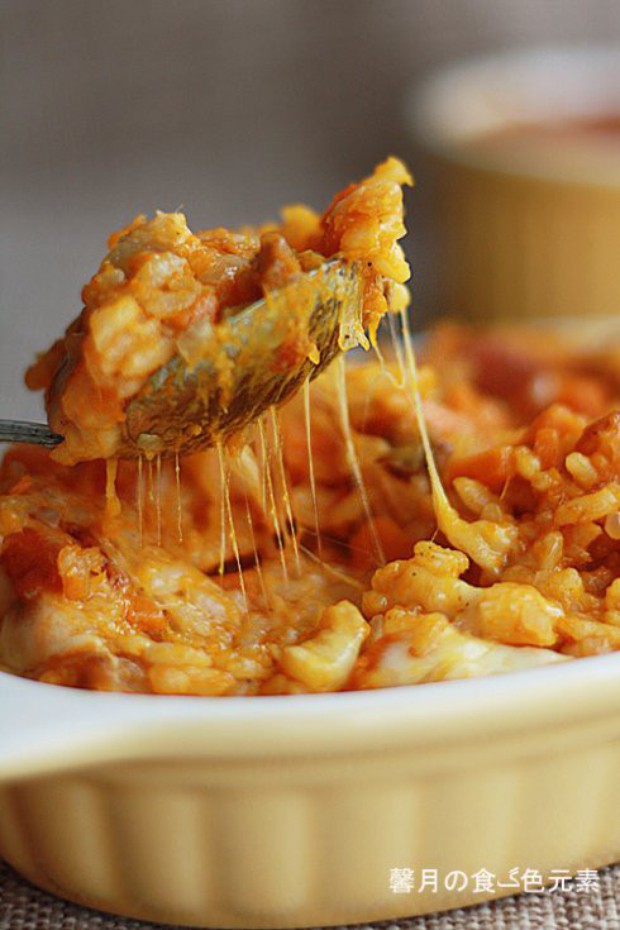 夏天的时侯团回来的大包马苏奶酪一直扔在冰箱还没怎么开包,总想着做点什么消耗消耗。可是我又懒,那个PIZZA想想就麻烦,一切需要揉面的工作俺都感觉很麻烦。正好遇到一碗剩饭,还有一个破南瓜,于是,这个南瓜焗饭就诞生了...对了,对了,说起这回买的南瓜,很有点搞笑呢。是我以超低的价格从超市的打折菜中淘回来滴。那天,俺抢了一个红灯笼大南瓜回家,价格嘛也可忽略不计,才1块来钱。回家后去掉裹南瓜的保鲜膜,发现,竟然有个破洞,正被那标签盖住。我,傻笑了一会!看以后还贪小便宜不贪,呵呵!有洞就有洞吧,反正不是烂的,不耽误吃就成。这个南瓜饭真是很好吃,好吃的程度让我怎么形容呢?就是我一顿吃了三大碗,哈哈!