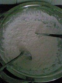 米粉,澄面,盐,味精,胡椒粉搅匀,将萝卜丝连汁水慢慢倒入搅匀的粉中,继续搅拌。