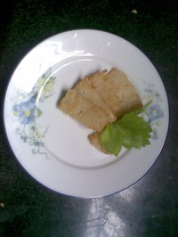 倒入模具里,隔水蒸40分钟。晾凉,待表面风干,脱模切片。【切片较厚,不要太薄】