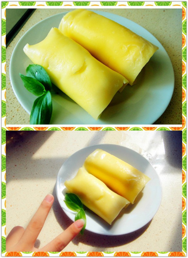 5. 将芒果切块,在皮内放一层奶油一块芒果,包起来就好了。