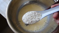 2. 倒入半瓶牛奶,想皮嫩点可以多加一些,之后用汤匙一匙一匙加入面粉,加一匙调和一次,前后大概加6满匙