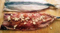 在其中一条鱼上均匀抹上出油以外所有的料再盖上一条秋刀鱼,这就合体了。