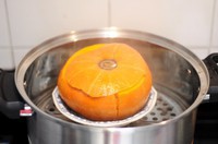 整个南瓜包括蒂头先放在蒸锅里小火蒸七八分钟;