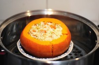 把椰浆饭塞入刚才蒸锅里的南瓜中,继续小火蒸到南瓜熟透即可。