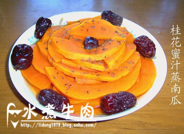 2. 将切好的南瓜片码放在盘中,浇上适当的蜂蜜和桂花酱,适当放上红枣上锅蒸约30分钟即可