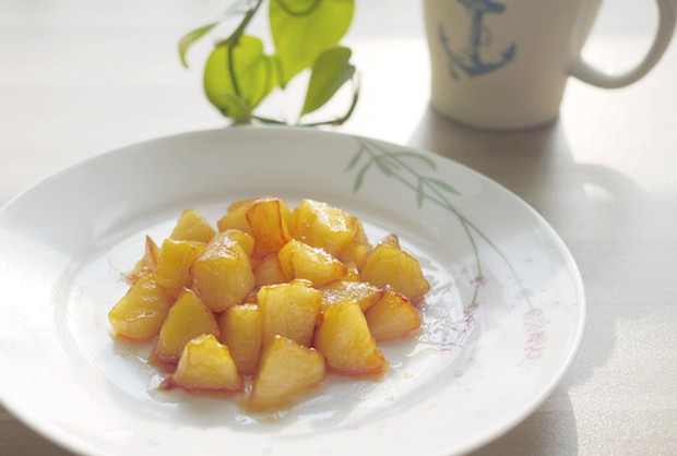 锅烧热入油,下白糖小火融化,等颜色变琥珀色关火将苹果丁加入,均匀沾裹起焦糖即可。