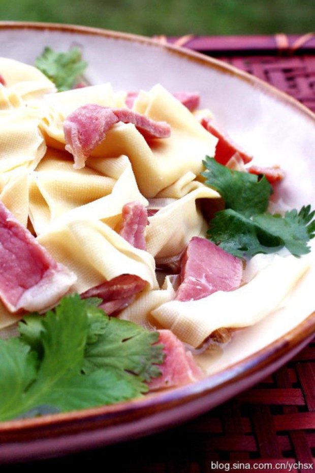 先用温水清洗咸肉,刷去表层附着物,泡掉硝碱气后切薄片,切片注意纹理,不要顺纤维切,而要把纤维切断