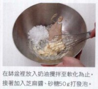 软化的黄油打松散后加入白芝麻酱和细砂糖1打发泡