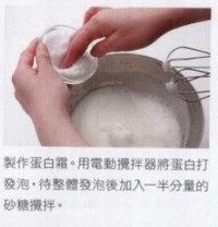 制作蛋白霜。用电动打蛋器将蛋白整体打发泡后加入一半的细砂糖2继续打。